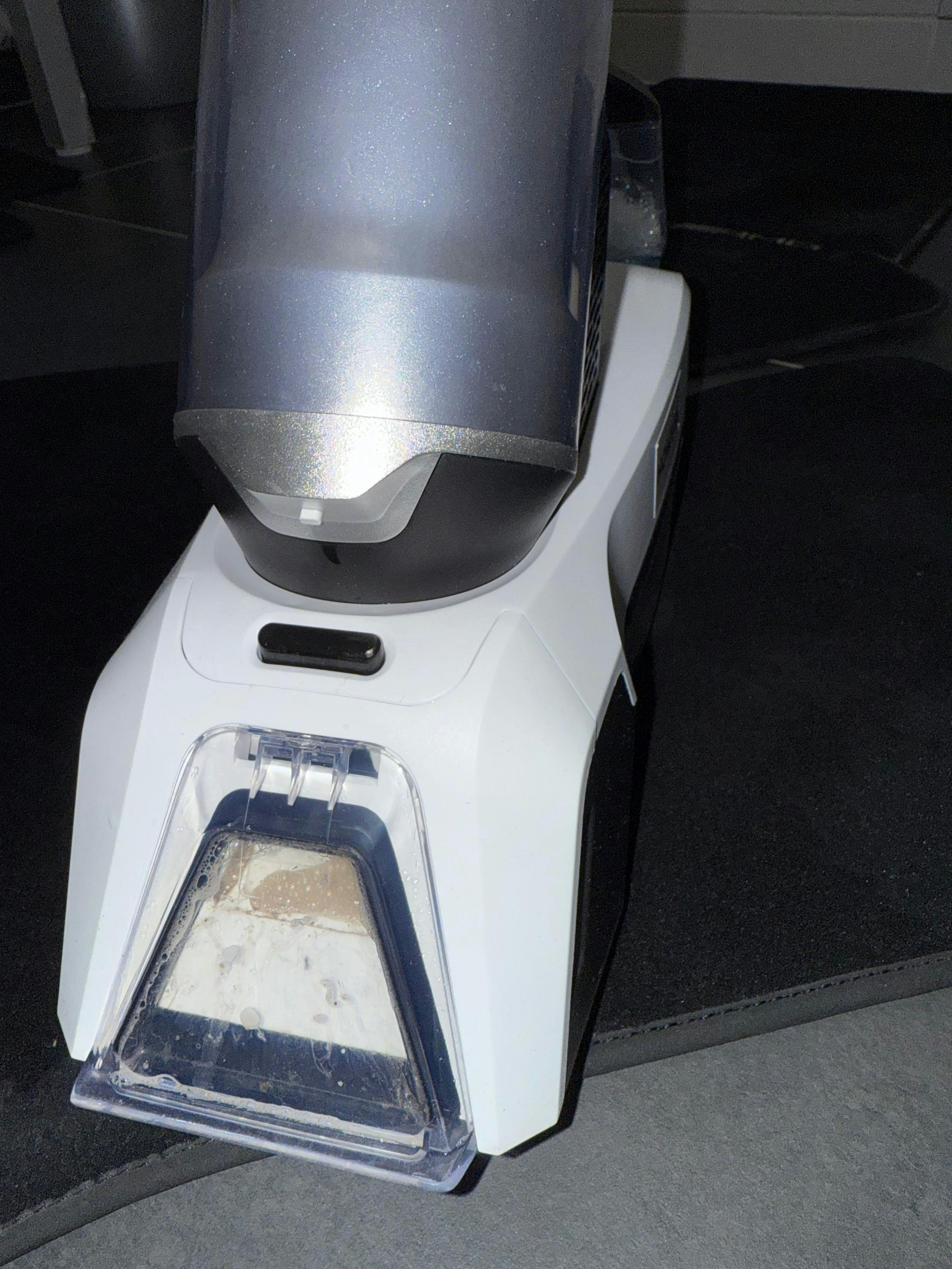 Aktiviere die Saugfunktion, um Schmutzwasser und Rückstände zu entfernen. Du kannst regelrecht zusehen, wie der Fleck im transparenten Schmutzwassertank verschwindet.