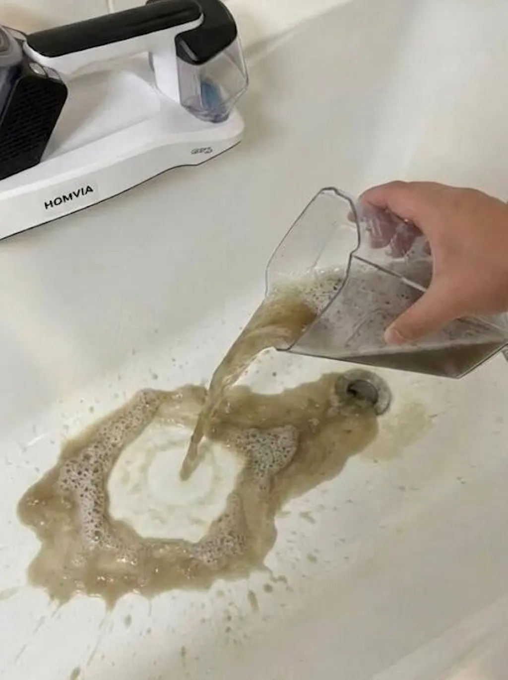 In wenigen Sekunden sieht die Oberfläche wieder wie neu aus. Das schmutzige Wasser wird vor deinen Augen abgesaugt – ein Beweis für die gründliche Reinigung.